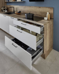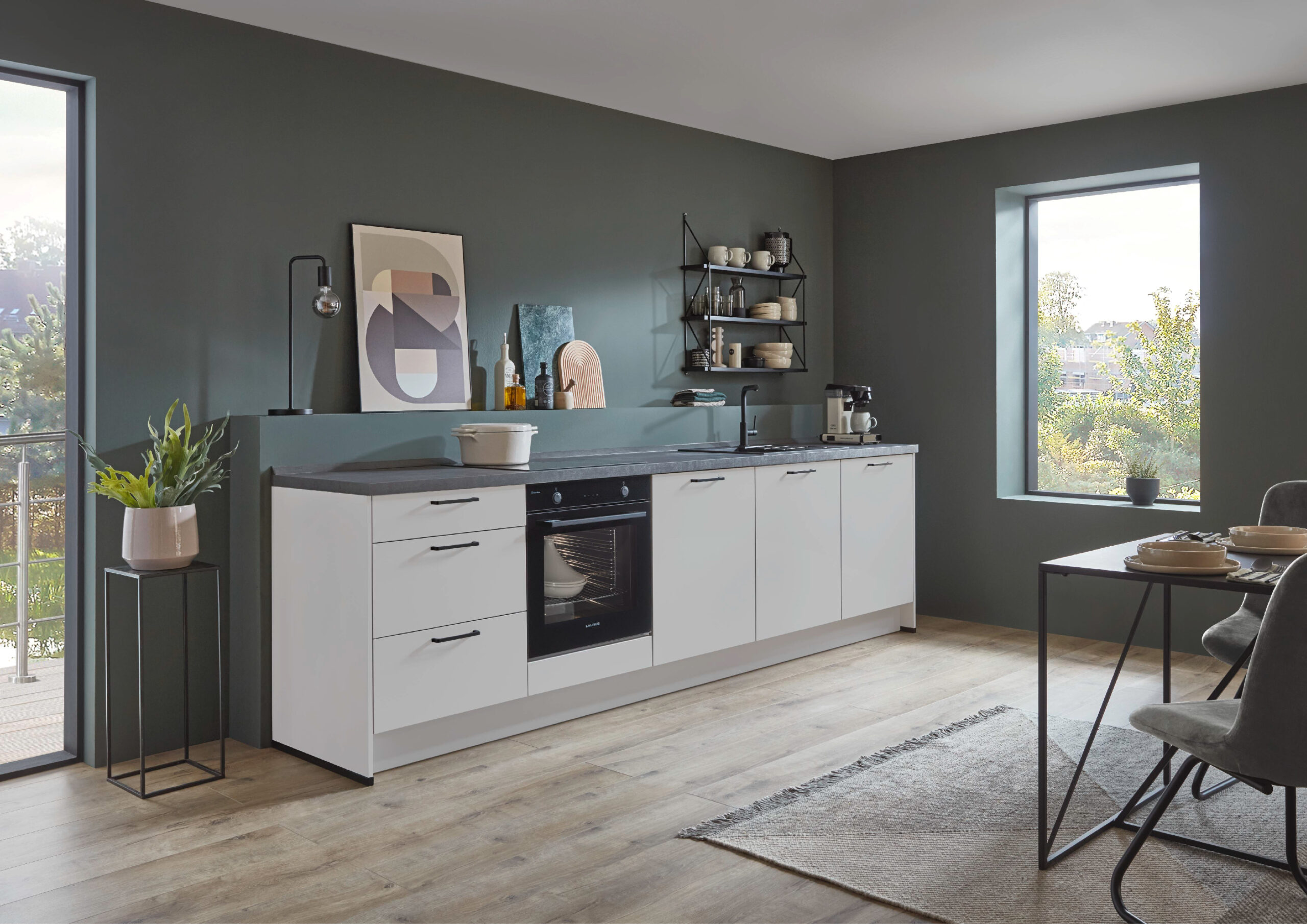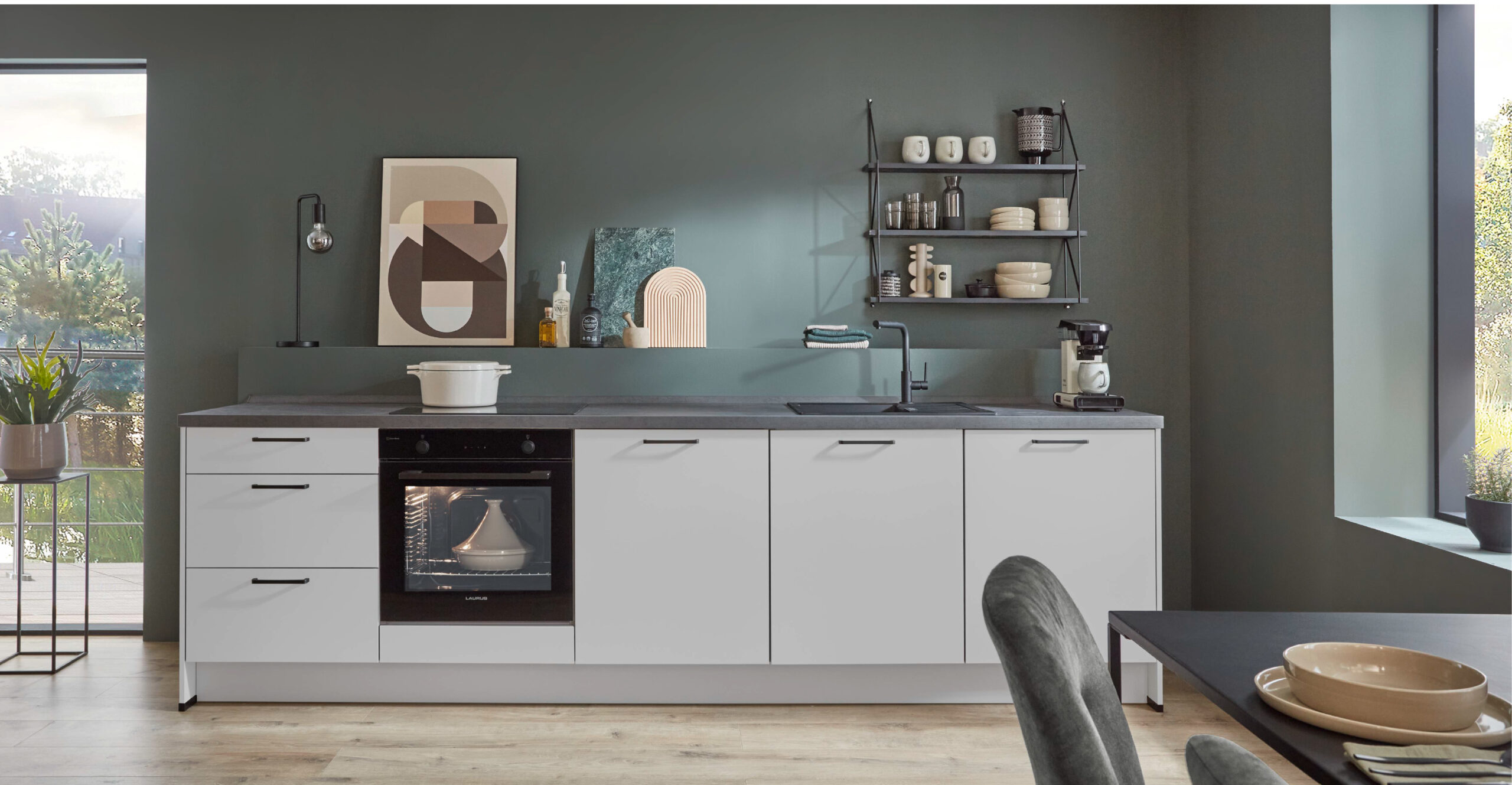 Diseño moderno y elegante con contraste entre gabinetes blancos y pared verde oscuro. Su distribución lineal optimiza el espacio, mientras que los detalles decorativos y estantes abiertos aportan estilo sin perder funcionalidad.