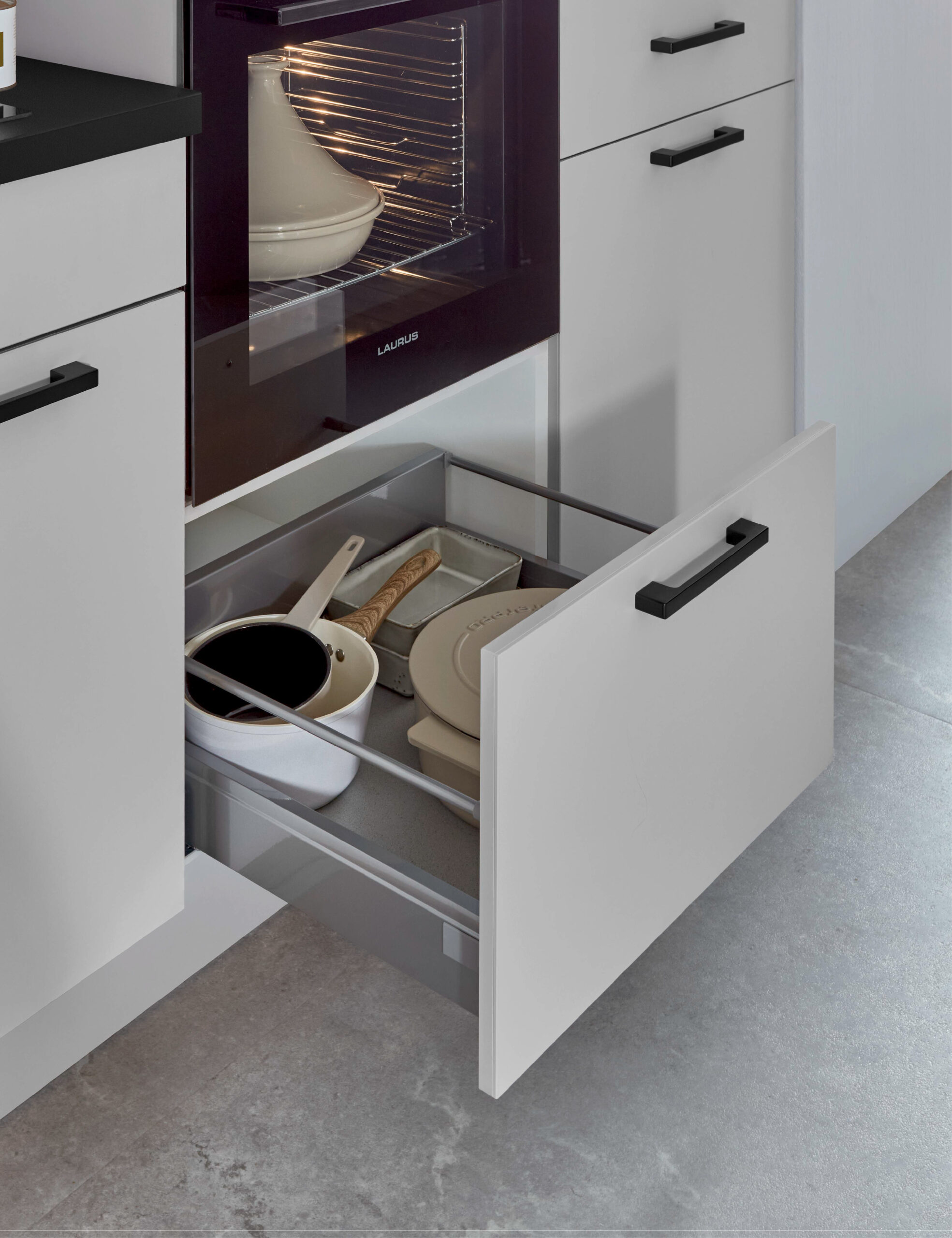 Estética minimalista y sofisticada con muebles blancos y detalles negros. La distribución limpia y vertical ofrece gran capacidad de almacenamiento, ideal para espacios integrados con el comedor